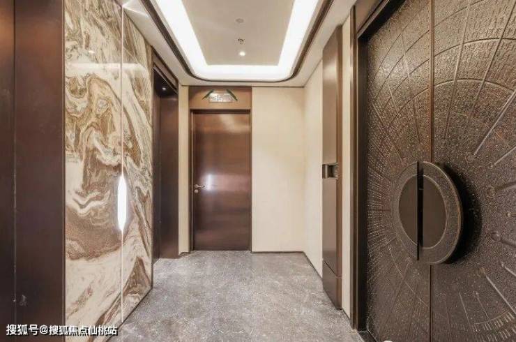 进入入户大堂,奢石的运用更是达到艺术化与功能性的共生。约3.5米宽、7.9米高的潘多拉奢石背景墙,石材天然的棕白纹理如飞龙盘旋而上,色彩随光影流动,赋予静态石材动态艺术感。