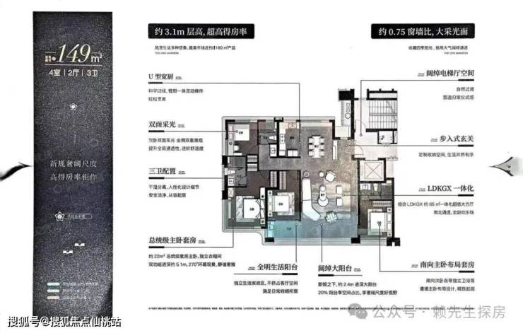• 景观视野优越:149㎡户型设计270°转角飘窗,采光与视野俱佳;