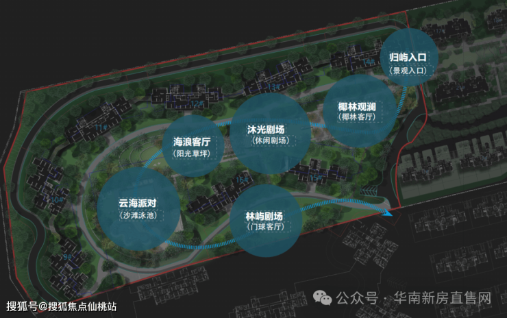 以“林屿” 为主线贯穿园林始终,结合度假生活的需求和海岛的居住文化、自然资源景观等,园林八大主题空间串联,包括椰林嘉观澜,沐光剧场、海浪客厅等场景交织,兼顾功能性和美观性,为湾区园林生活树立一个新标准。