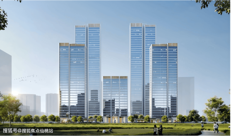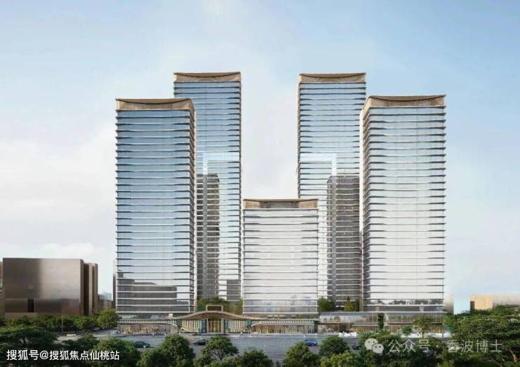 整个项目共有5栋楼,在正面看非常具有对称美感。其中前排两侧为32F/100m的高层,后排两栋为45F/150m的挺拔超高层。这四栋高楼共同围合着中间这栋小高层,这也太讲究了?!正中间这栋楼到底是什么来头?