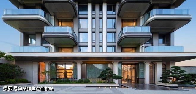 住宅建筑外立面以铝板、玻璃为主,基座采用部分石材;南洋闽派风格;闽派骑楼拱廊巨构化,150米立面以传统元素创新演绎,厚重拱券高低错落,柱廊韵律细密交织,结合四代宅空中挑台,形成现代闽派地标符号。