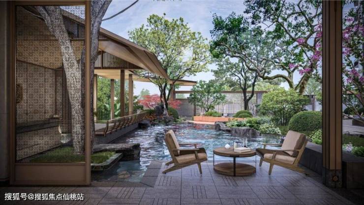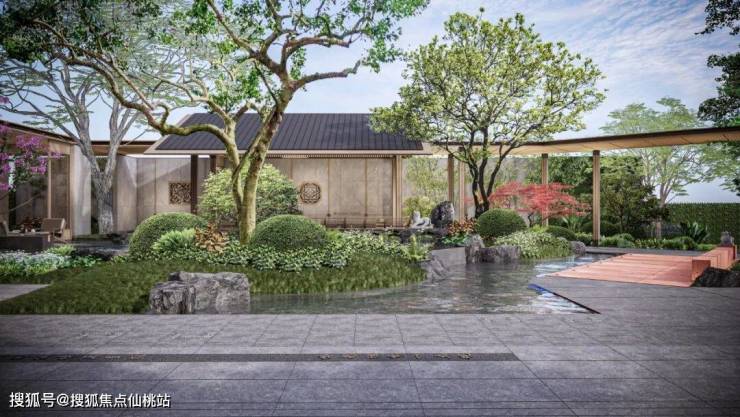 灵动水景环绕着错落山石,与环境共生共融,既承宋风之韵,又化山野飞瀑为庭中景,给静谧空间增添几分自然野趣。