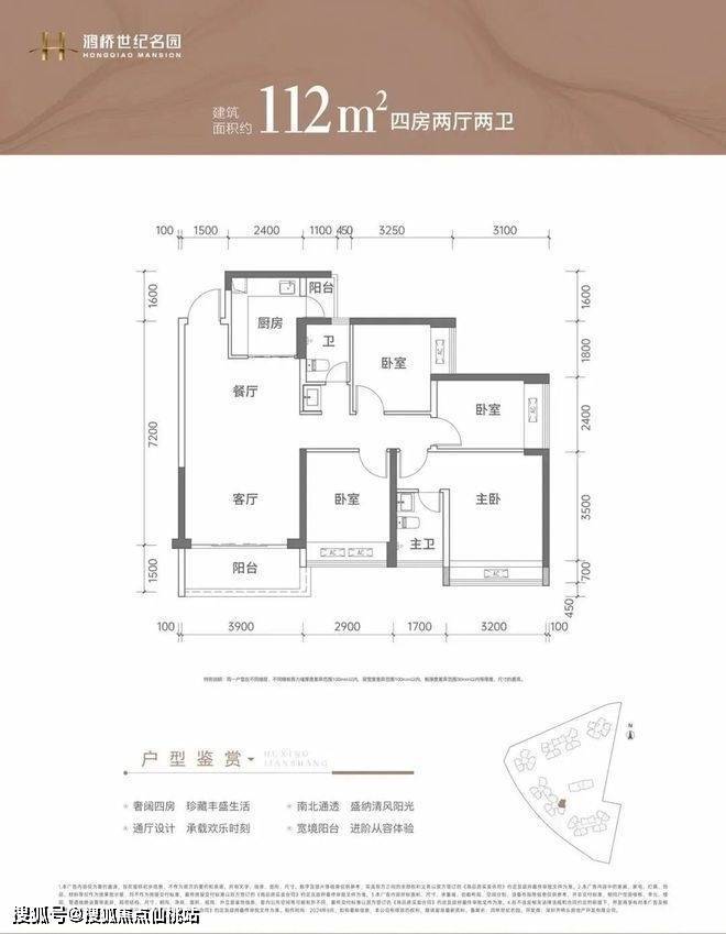 112㎡的4房2厅2卫:经典竖厅格局,客厅3.9米开间,LDKB一体化设计,4个卧室分别做到了3.2米/2.9米/2.55米/2.4米的宽度,L型厨房带1个小生活阳台,公卫三段式分离,东南朝向。