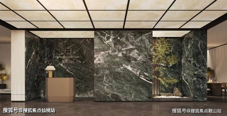 大堂墙体普拉达绿奢石 ,质地坚硬而耐用,搭配古铜色铝板,气质高贵而典雅。