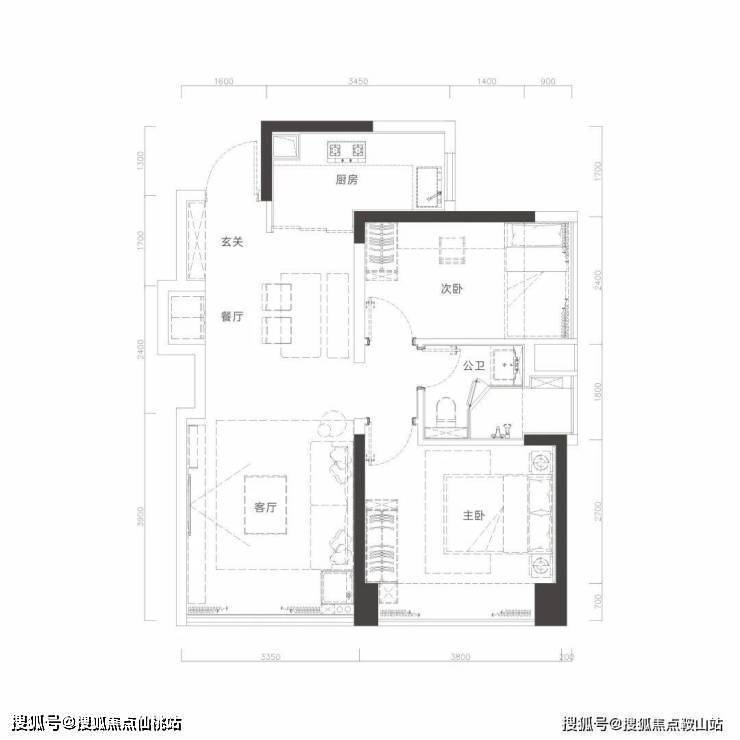 玄关入户,便捷收纳;约3.35米面宽客厅,约8米进深,客餐厅一体化;
