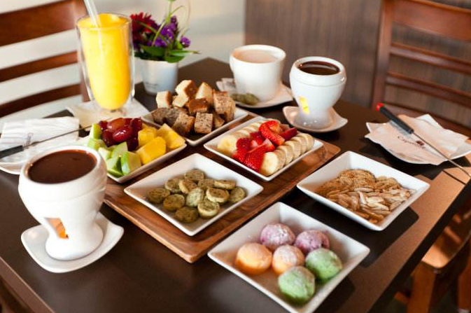 边聊天边品尝被柔滑巧克力酱包裹的鲜果