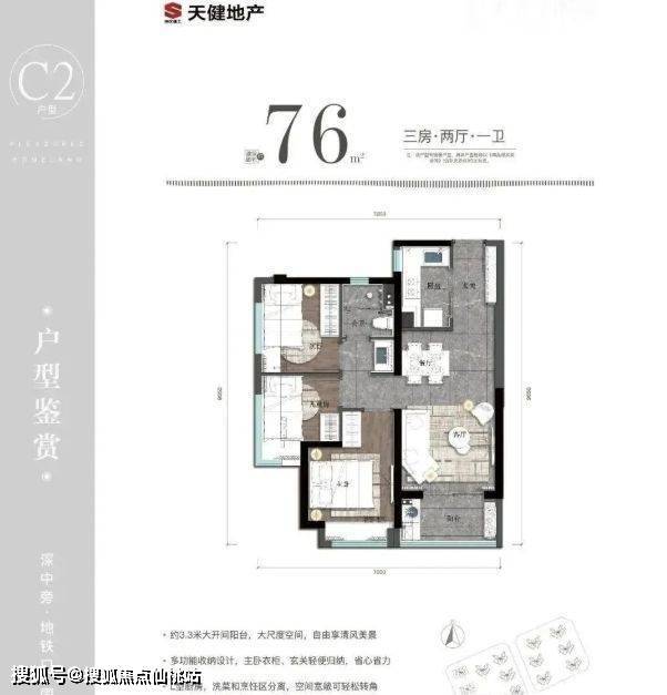 76㎡的3房2厅1卫:设计的是竖厅格局,进门入户玄关,客厅3.3米开间,L型厨房,卫生间三段式分离,得房率75.05%(不含赠送),阳台朝西北、西南或东北向。