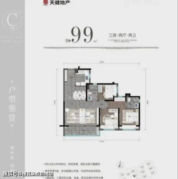 99㎡的3房2厅2卫:设计的是经典竖厅格局,可以改4房,进门入户玄关,客厅5.3米开间,三开间朝南,U型厨房,公卫三段式分离,得房率81.7%(不含赠送),阳台朝西南向。