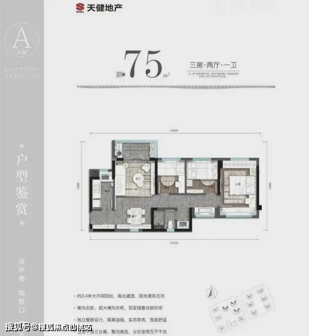 75㎡的3房2厅1卫:设计的是竖厅南北通透格局,进门入户玄关,客厅3.4米开间,L型厨房,卫生间三段式分离,得房率81.3%(不含赠送),阳台朝西北或东北向。