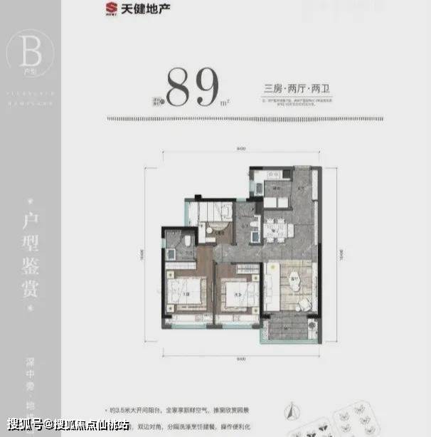89㎡的3房2厅2卫:设计的是经典竖厅格局,进门入户玄关,客厅3.5米开间,三开间朝南,U型厨房,公卫三段式分离,得房率81.3%(不含赠送),阳台朝西南或东南向。