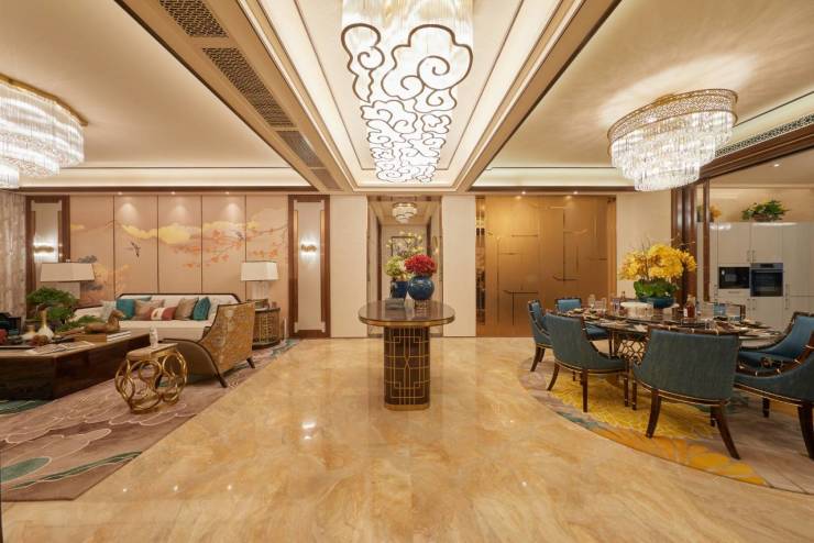 工艺:丰富饰线、中式雕花、对称木饰、繁复装帧,看不见的隐蔽工程亦不遗余力投入,全面落地星河湾4.0标准
