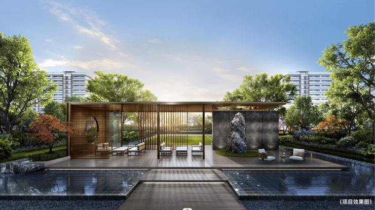 两轴五进一环多景,主入口清流浅溪、名贵造型松三株迎客,吉祥如意