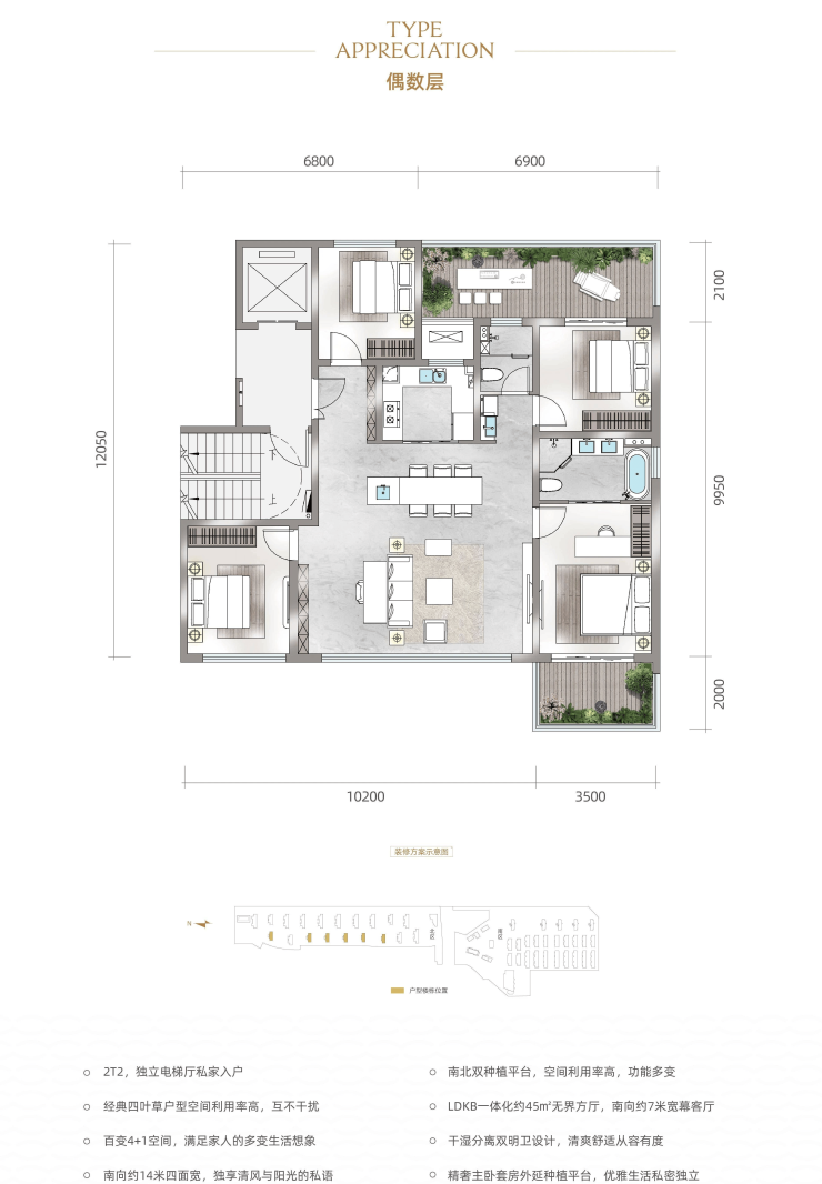 创新四代宅设计理念,汲取大师级的立面选材标准,采用“香槟金铝板+银白色一体板+玻璃栏板+low-e玻璃”材质,奢雅大气的建筑立面,凸显现代轻盈质感和科技时尚感。