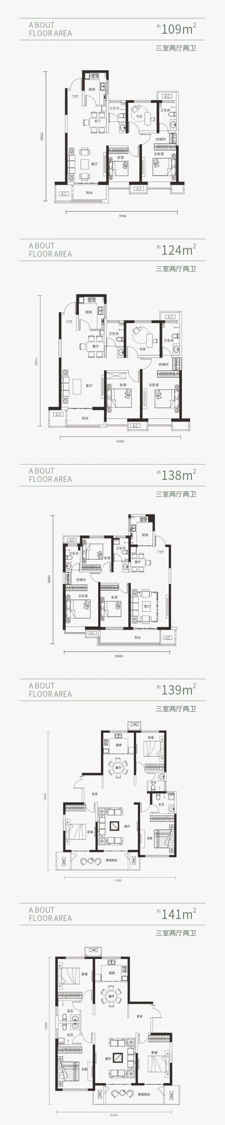 目前项目推出的一期3栋楼(高层10-12#楼),共计520套房源,户型面积分别为109㎡、124㎡及138㎡,均为三室两厅两卫设计。