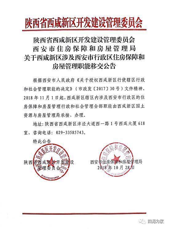 10月28日,西咸新区开发建设管理委员会和西安市住房保障和房屋管理局联合发布《关于西咸新区涉及西安行政区住房保障和房屋管理职能移交公告》。