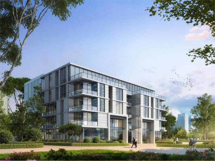 外立面采用石材+玻璃幕墙,大面积落地窗设计采光充足,办公环境更为舒适;