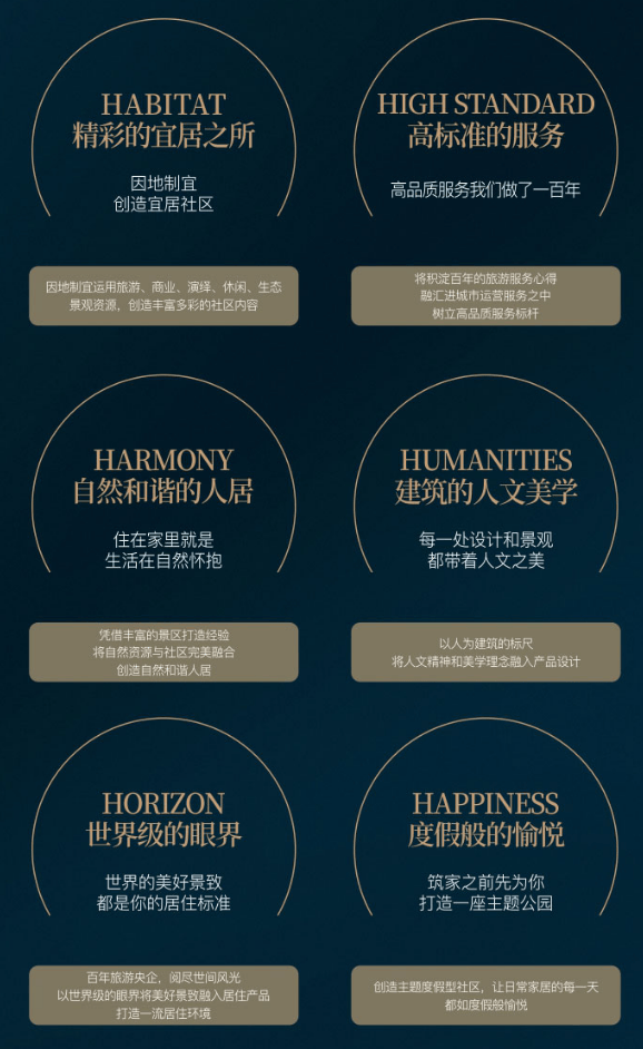 以世界级的眼界、自然和谐的人居、度假般的愉悦建筑的人文美学、精彩的宜居之所、高标准的服务