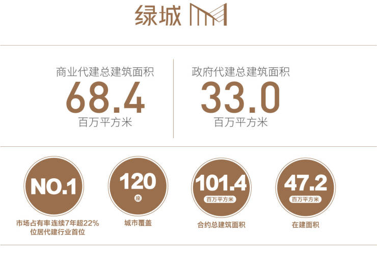 绿城管理已连续七年保持行业市场份额22%以上,稳居行业第一身位。目前已进驻120座城市,合约总建筑面积约1.014亿㎡,在建面积约4720万㎡。