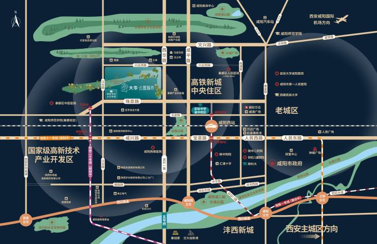 项目坐落于咸阳高新区高铁新城,于咸平路与宝泉路十字价值交汇轴上,优享主城及新区双向红利。随着西咸一体化的战略推进,围绕“一河两岸”形成科创黄金三角。区域内知名品牌高端社区形成中央住区,未来将成为咸阳下一个城市中心。