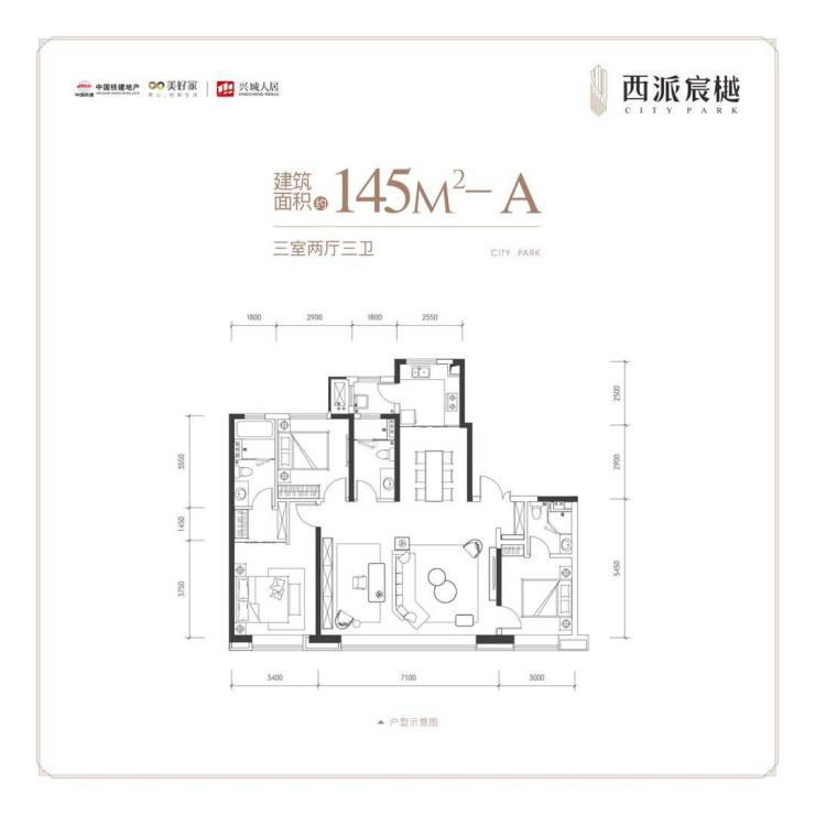 建筑面积约145㎡A三室两厅三卫