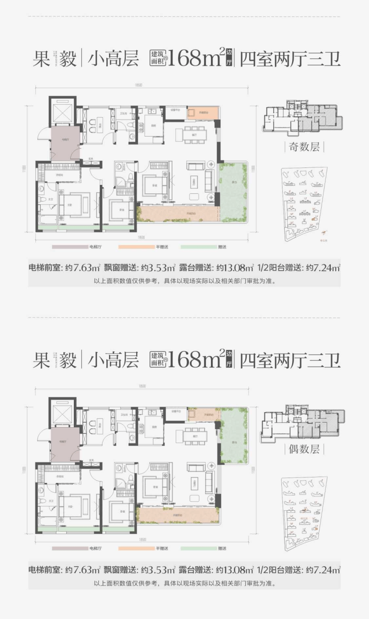 22栋14-17层纯粹小高层,最低实际得房率约87.9%起;约7.3827.15㎡空中露台,约6.3-6.6米露台挑高揽尽河园风光。