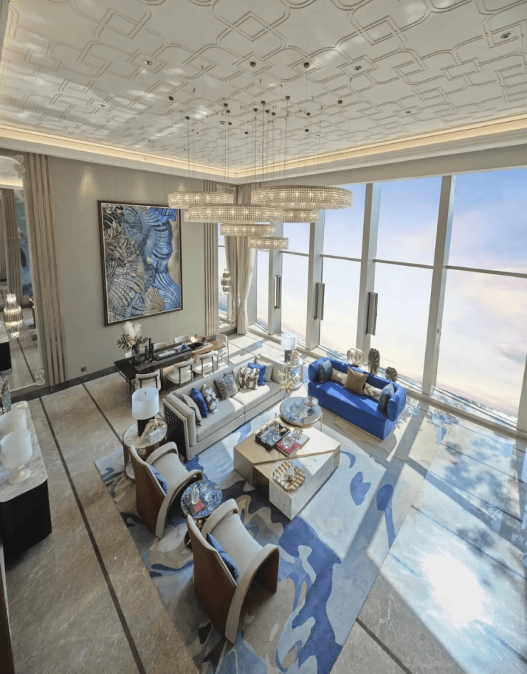 二期规划12栋高层大平层,21-28层,2梯2户;四种户型,278,300,320,400平。层高3.43-3.6m;首层全部架空,圈层纯粹,水系环绕,配置室外泳池。