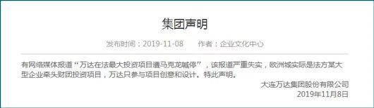 11月8日早间,万达集团在其发布官网声明称,有网络媒体报道“万达在法较大投资项目遭马克龙喊停”,该报道严重失实,欧洲城实际是法方某大型企业牵头财团投资项目,万达只参与项目创意和设计。