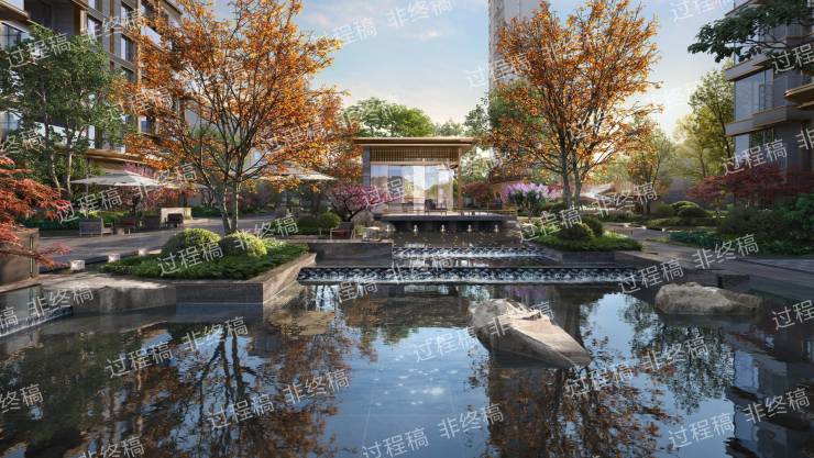 打造约1380㎡灵动水境,从“曲江流饮”中汲取灵感,以叠水、静池、瀑布等多种形态,再现盛唐曲江池的开放与灵趣,重塑当代社区的亲水生活范本。