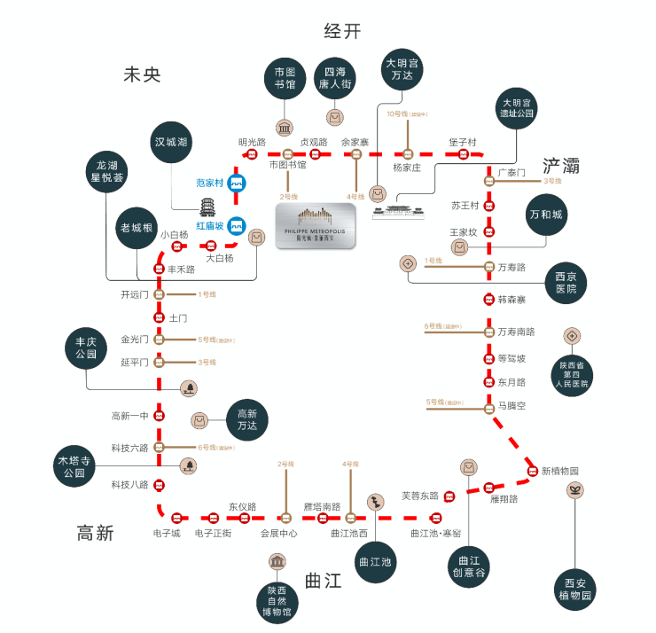 公园配套:临近两处国家级遗址公园配套,项目向西约1.3公里处可抵达汉城湖公园, 向东约2.8公里处可抵达大明宫遗址公园,让休闲生活更静谧、随心、纯粹。