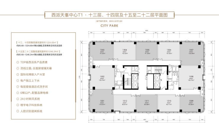 ◎TOP级西派系产品质素 ◎流线立面全面屏玻璃天幕 ◎国际化精装入户大堂 ◎每户独立上下水 ◎每层星级酒店式洗手间 ◎6梯12户配置品牌电梯 ◎24小时新风系统 ◎楼宇电子科技系统 ◎人脸识别道闸系统
