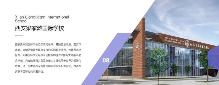 西安梁家滩国际学校位于沣河东岸,是陕西省政府、西安市政府,高新区管委会重点支持的国际教育项目,也是西北地区第一所由国际文凭组织认证授权的世界IB国际文凭组织成员学校,为在陕外籍人员及高端人才提供同步世界的国际化教育,进一步提升西安高新区国际化服务配套水平,推动西安教育国际化的发展步伐。