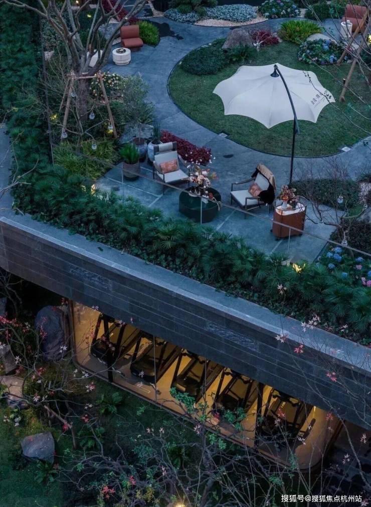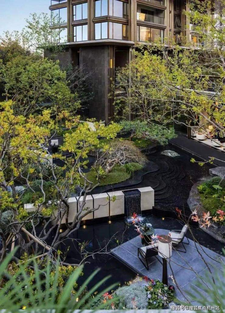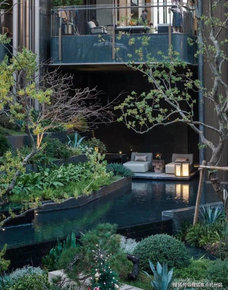 而在3、5号楼之间,则搭建了【围炉夜话】场景空间。古木纹奢石砌成的火炉旁,整木炭化石凳散发着山林野趣,一株红舞姬枫树翩然伴舞。冬日傍晚,好友围坐,体会名门温情。