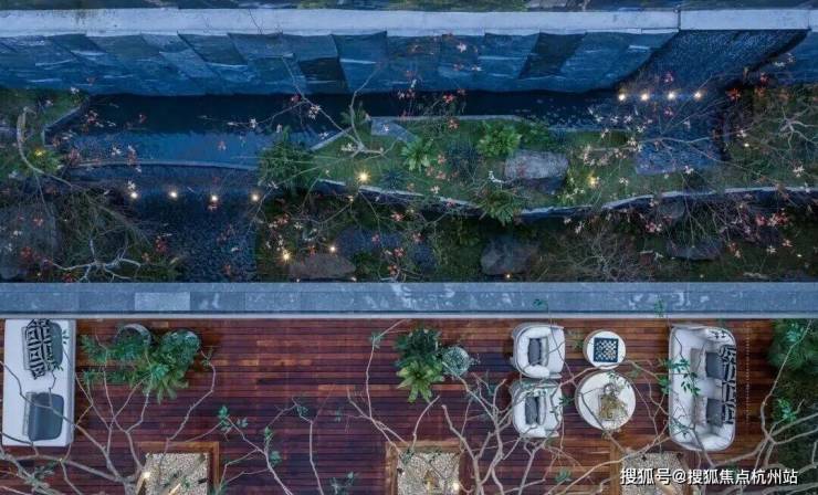 向上,则是整座溪谷的观景逸闲之处——【悬浮茶室】,它凌于山川溪谷之上,收纳庭院的万千水意,搭配巴西高山流水石桌面,于此静憩,自得静心。
