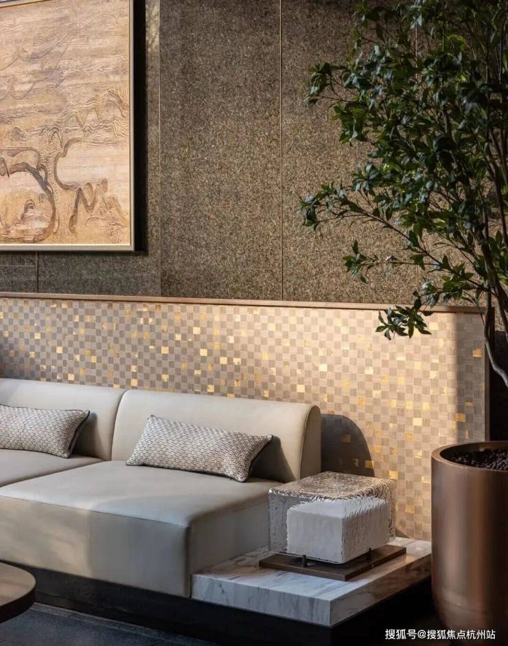 黄金丝绸大理石流转着真丝般的光泽,白玉与卡里冰玉小台映照天光云影。