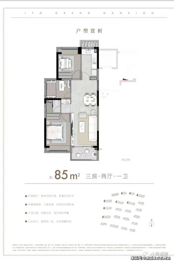 户型解析:约85㎡的3房,这种入门级的产品也要保证居住的尺度感。比如利用L形厨房与餐厅相连接,一体化的设计让空间充足利用。比如次卧连接阳台,就是人性化考虑到给他们一个私密的追光天地。