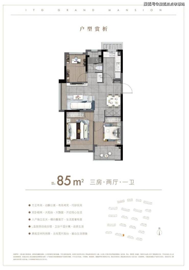 户型解析:约85㎡的3房,这种入门级的产品也要保证居住的尺度感。比如利用L形厨房与餐厅相连接,一体化的设计让空间充足利用。比如次卧连接阳台,就是人性化考虑到给他们一个私密的追光天地。