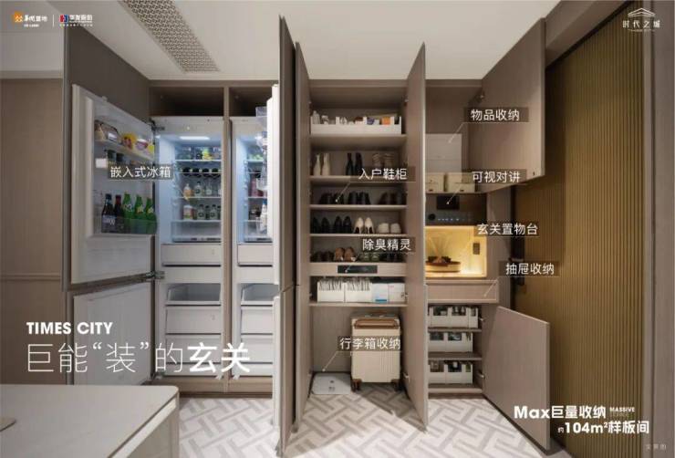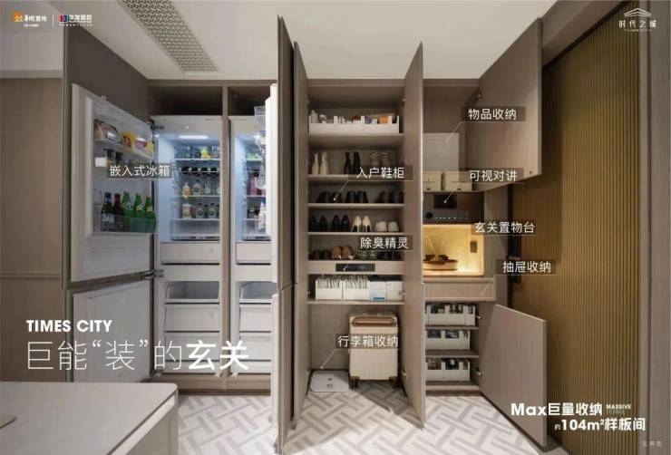 参考过往样板间,「时代之城·雲墅」售楼处电话:400-8855-420【☎️售楼处认证】✨✨✨项目进门右手是一整盘玄关柜,含S墙在内的通顶柜体,可以收纳各类生活物品,鞋子、行李箱、杂物等做了很多分区。其中玄关置物台还是带奢石的,点缀其中。
