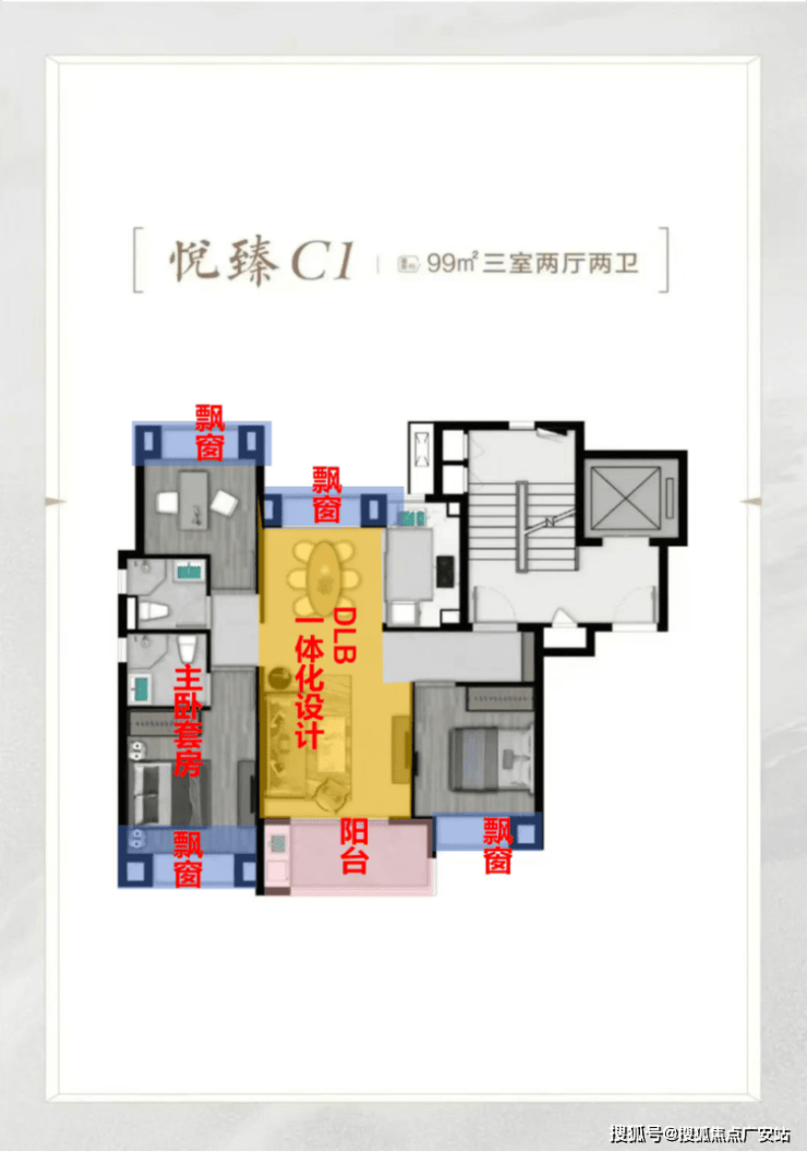 三开间朝南、室内“4个飘窗+1阳台”、再加上“2卫”的设计,不管是采光、视野、通风、私密性,还是实用性都十分出色。