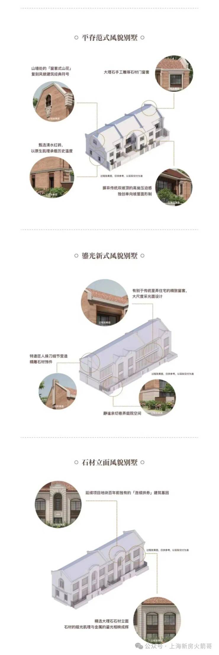 除了户型设计上的全面创新,项目还是全上海第一个多元化形态风貌别墅新房,引入了5大经典风貌建筑制式,让产品立面形态更加多样:
