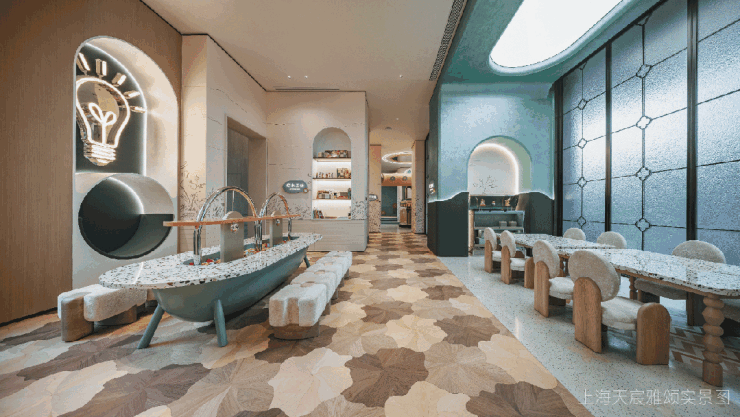 以“气泡”为灵感,莫奈画作的唯美色系作为调色盘,悬浮的玻璃气泡裹着星光生长晕染出的一层层水、一道道光,将气泡如星尘倏忽绽裂的瞬间定格于水院中,在光影漫游中舒展成诗,述说着浪漫与优雅美学的艺术花园。