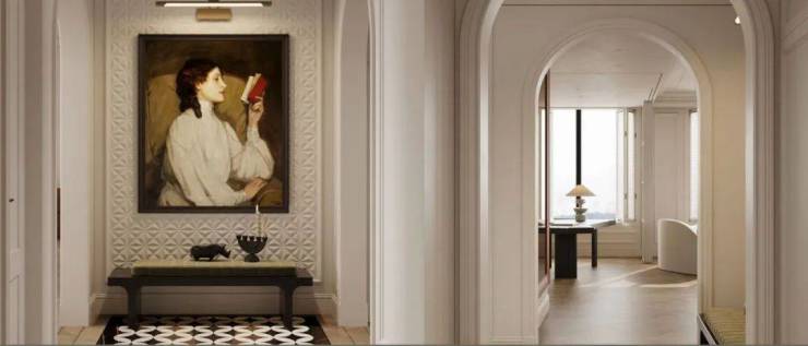 电梯厅以法式宫廷风流线型化设计,潮流艺术、流畅大气,空间更显通透,明亮、优雅、高贵的氛围扑面而来。两边拱形门洞和立柱,不仅增加了尊贵的仪式感,也提升了空间转换的联动性。