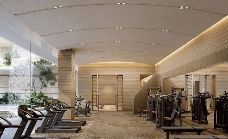 区域首创国标壁球馆、飞瀑园景健身房、嵌入式景观书吧等,整体统一化仿树榴木纹贴面,还原内外统一的高级度假酒店质感。