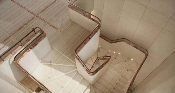 立体下沉会所由艺术旋转楼梯进入,整块白木纹石材切割+宝格丽粉镶边设计的旋转楼梯,营造社区高雅氛围,步步生花。