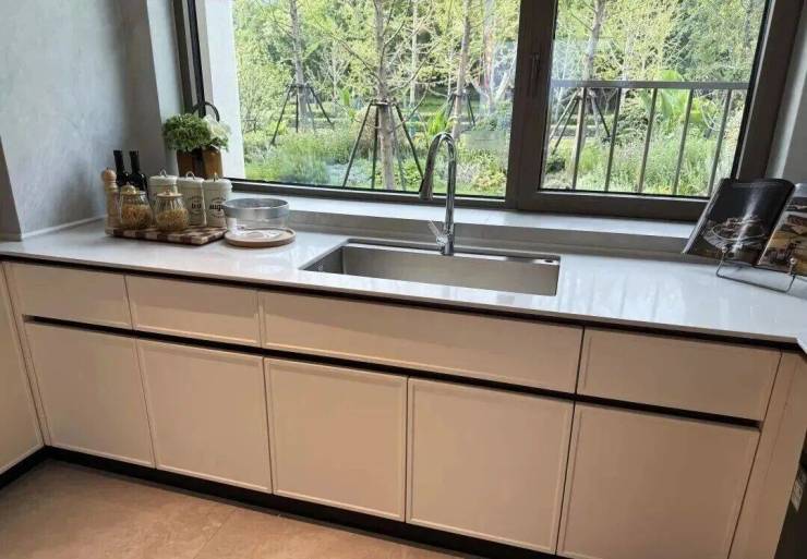 同时厨房也附赠飘窗,将飘窗台面与橱柜一体化设计,做为了水槽区域,极大的提高了厨房空间的实用面积!