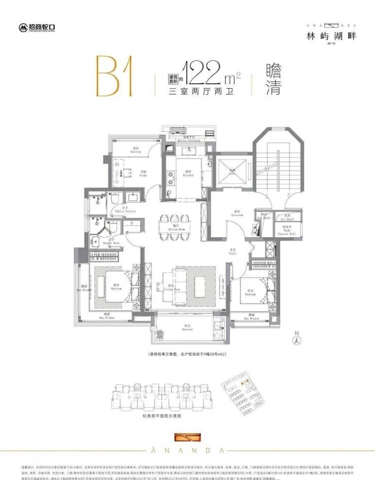 项目将推出建面约112㎡、122㎡、145㎡高层3-4房以及建面约160-165㎡叠墅,共计624套,其中112户型为一梯两户,122户型两梯两户。