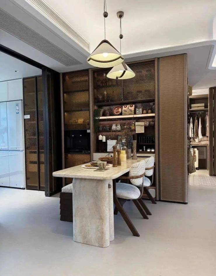 约5米面宽横厅,多出来一个灵动空间,可根据个人需求定制为开放式书房、茶室等;岩板+金属饰面电视背景墙同样为交付标准;