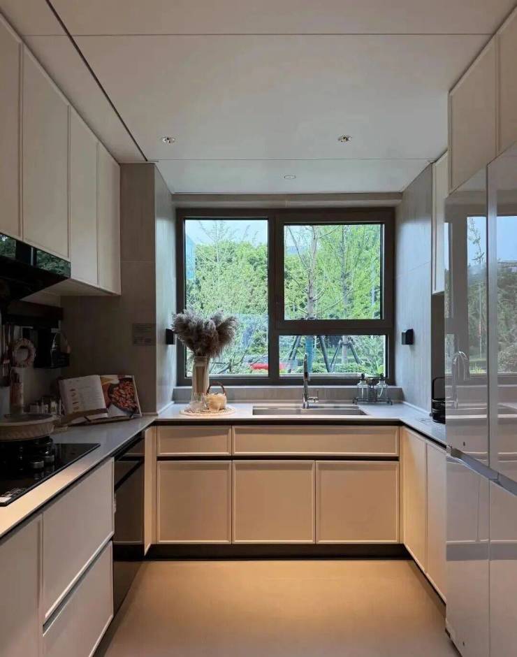 U型厨房,配置方太四件套(油烟机、灶具、洗碗机、蒸烤一体机)、科勒水槽及龙头等,基本所见即所得;