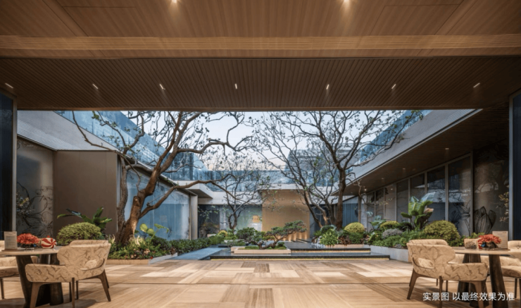 会所整体采用围合式建筑设计,会所沿着下沉庭院四周展开,内外情景交融,满足业主日常娱乐需求。