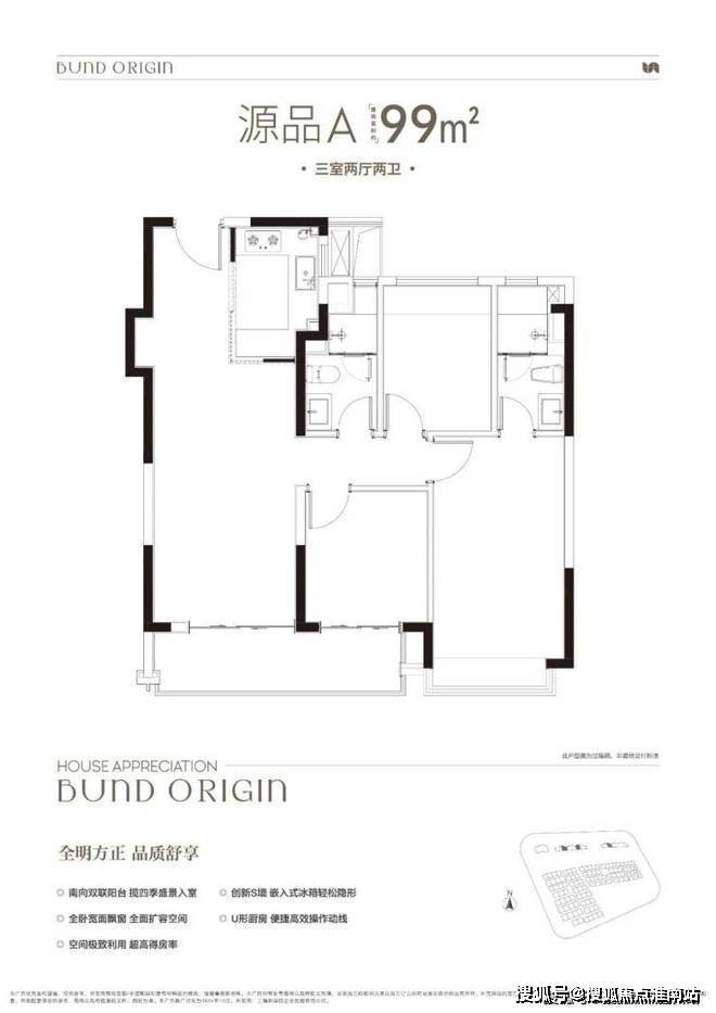 建面约99㎡3房2厅2卫,非常标准的动静分离、三开间朝南户型。