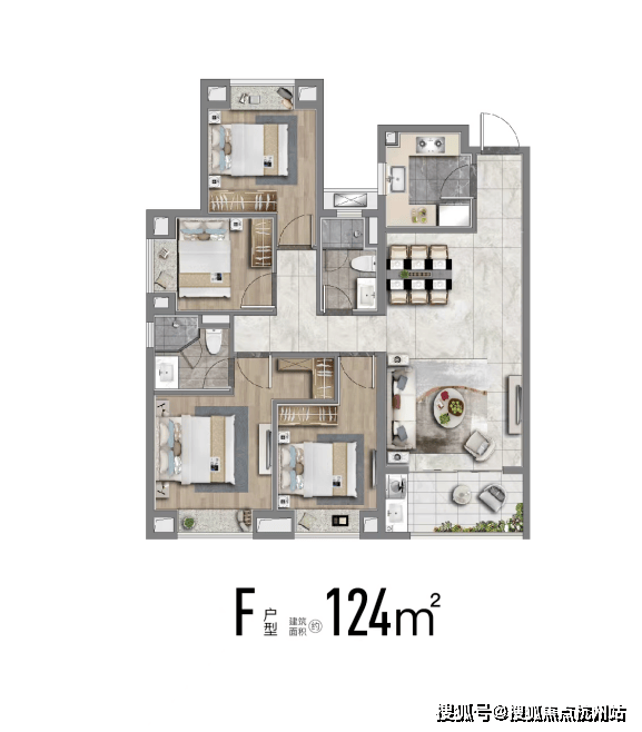 建面约124m²四房,市面常见的四房普遍要135平,这个约124平米户型功能性拉满,且控制了总价,给予更多小伙伴一步到位的机会。